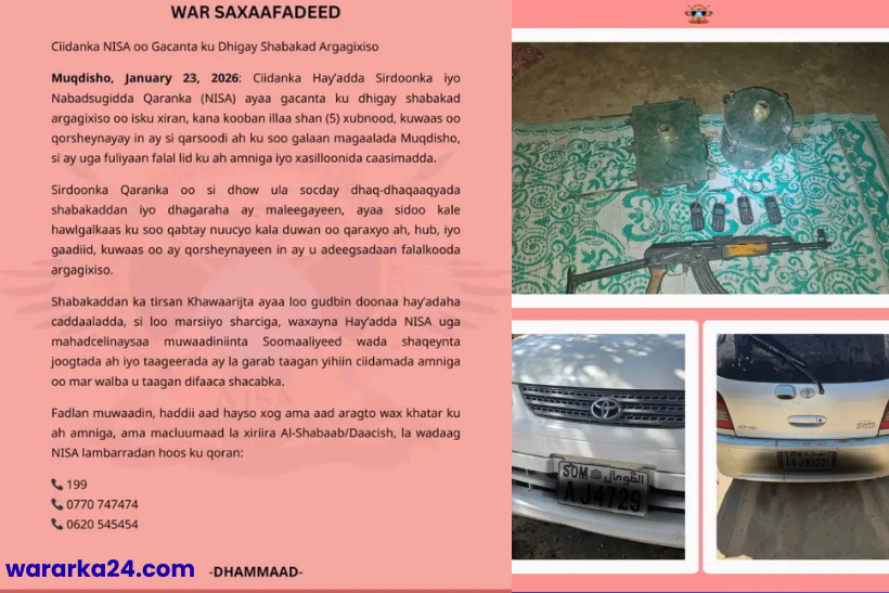 Wararka24: 24-01-2026 Hay’adda Sirdoonka iyo Nabadsugidda Qaranka (NISA) ayaa shaacisay inay gacanta ku dhigtay shabakad ka kooban shan xubnood oo ka tirsan Al-Shabaab, kuwaas oo lagu eedeeyay inay qorsheynayeen falal amni-darro ah oo ka dhaca magaalada Muqdisho.