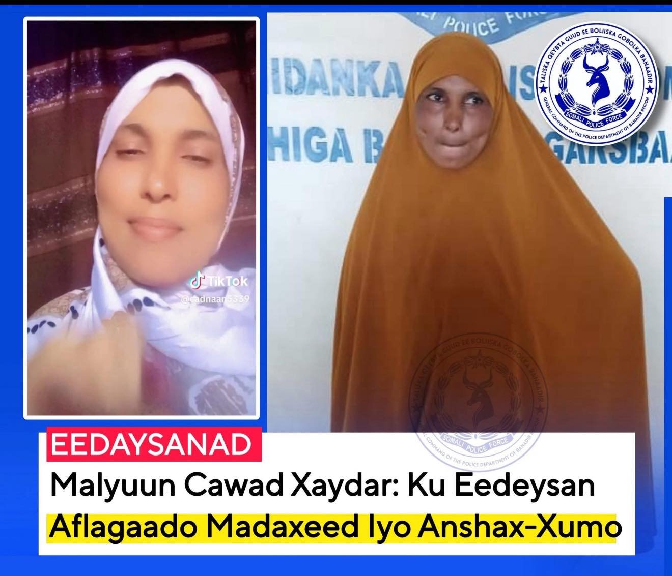 Muqdisho – Booliska Soomaaliya ayaa xiray haweeney lagu magacaabo Malyuun Cawad Xaydar, kadib markii lagu eedeeyay inay aflagaado u geysatay Madaxweynaha Jamhuuriyadda Federaalka Soomaaliya, Xasan Sheekh Maxamuud, iyadoo muuqaal ka duubtay baraha bulshada gaar ahaan TikTok.