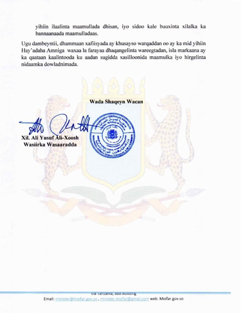 Waxaa sidoo kale la faray hay’adaha amniga iyo dhammaan xafiisyada ay khusayso wareegtada inay dhaqan geliyaan go’aankan, si loo xaqiijiyo xasilloonida iyo sii socoshada maamulka.