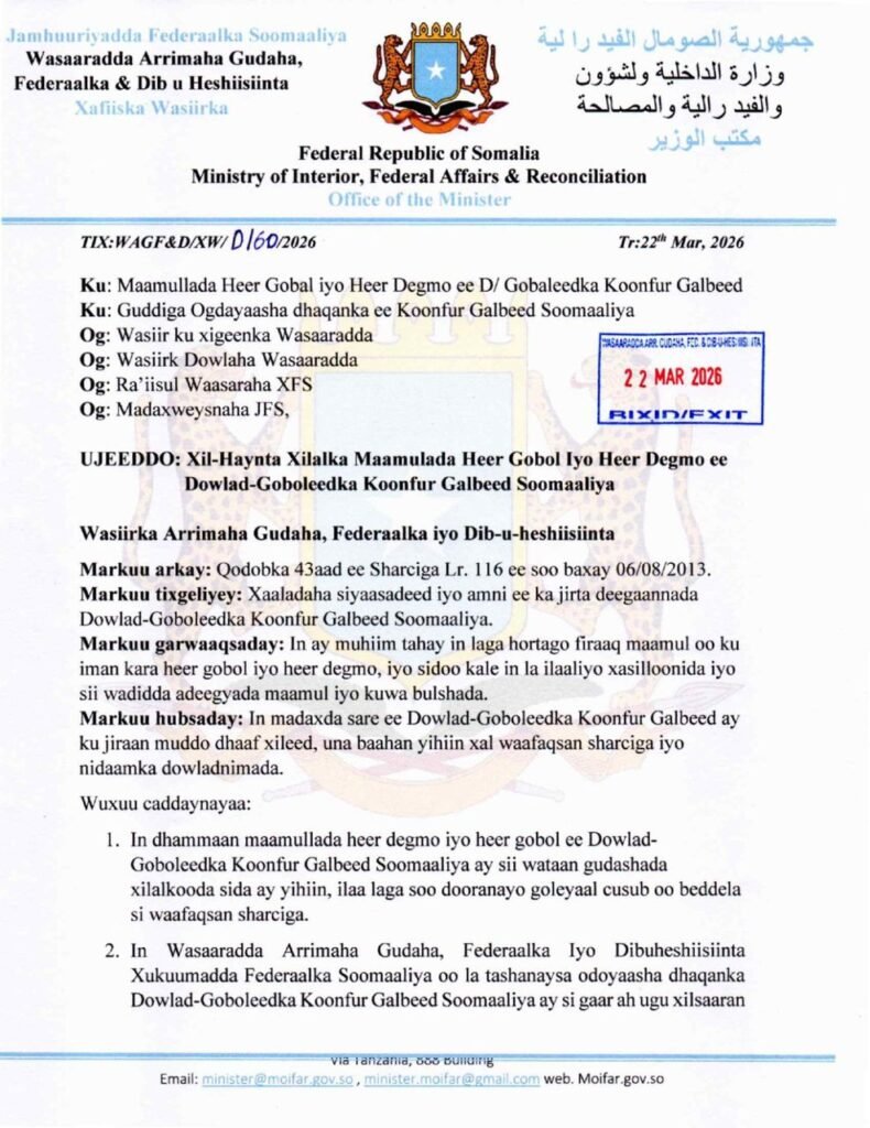 Wasaaradda ayaa tilmaantay in go’aankan uu ku saleysan yahay xaaladaha siyaasadeed iyo amni ee ka jira deegaanada Koonfur Galbeed, si looga hortago firaaq maamul iyo carqalad ku timaada adeegyada bulshada.