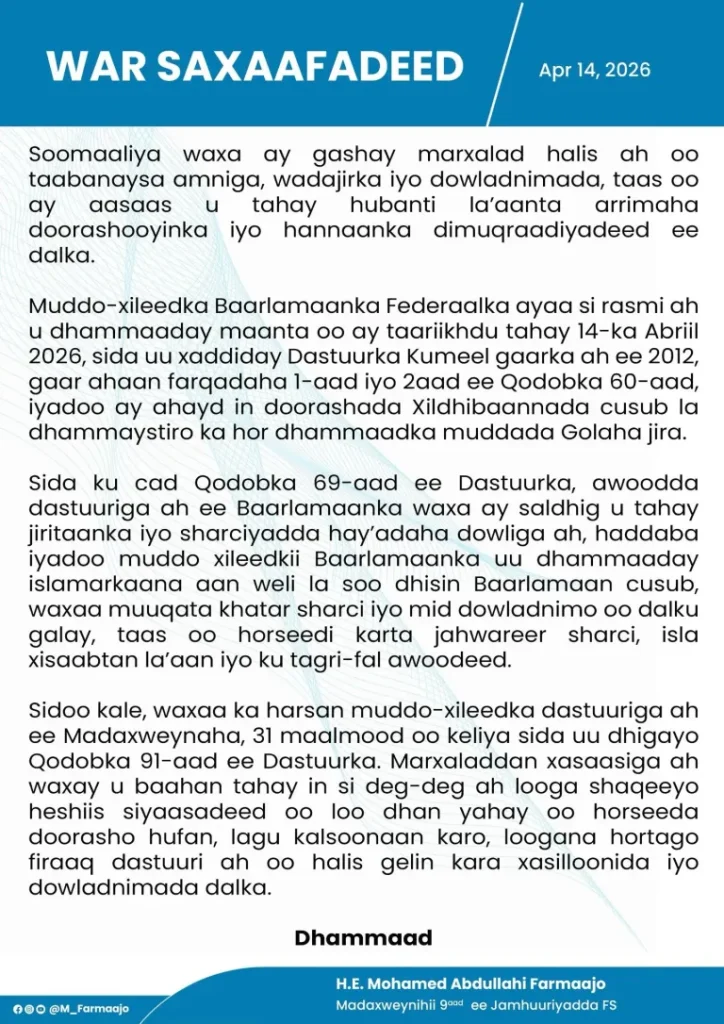 Wararka24: Madaxweynihii hore ee Soomaaliya Maxamed Cabdullaahi Maxamed ayaa sheegay in dalka uu galay marxalad halis ah, kaddib markii uu dhammaaday muddo xileedkii Baarlamaanka Federaalka. Hadalkan ayaa ku yimid warsaxaafadeed uu si rasmi ah u soo saaray.