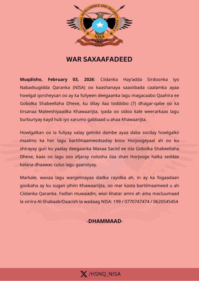 Wararka24: 4-02-2026 Hay’adda Sirdoonka iyo Nabadsugidda Qaranka (NISA) ayaa sheegtay in ay xalay fulisay howlgal amni oo qorsheysan oo ka dhacay deegaanka Qaahira ee Gobolka Shabeellaha Dhexe, kaasi oo lagu beegsaday xubno ka tirsan Al-Shabaab, sida lagu sheegay war-saxaafadeed ay hay’addu soo saartay.