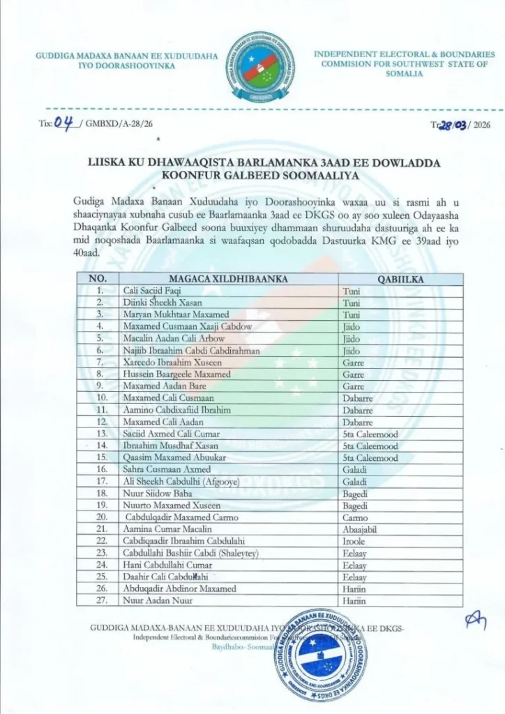 Wararka24: Guddiga madaxa bannaan ee doorashooyinka Koonfur Galbeed ayaa saq dhexe xalay shaaciyay liiska xildhibaannada cusub ee Baarlamaanka saddexaad ee maamulkaasi.