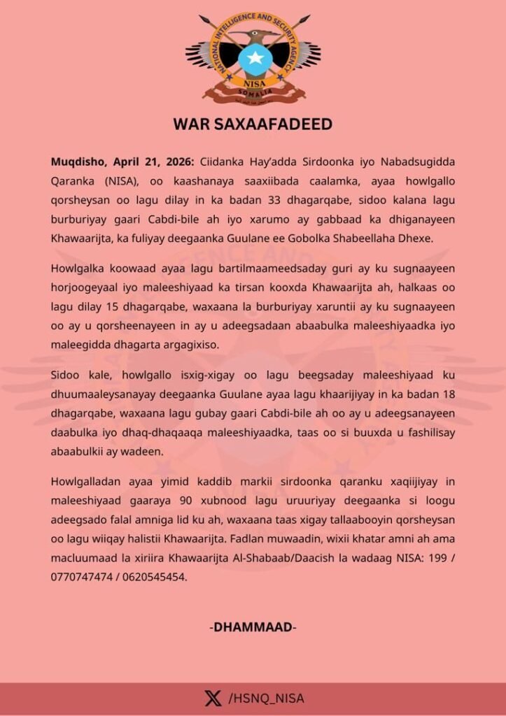 Wararka24: Hay’adda NISA ayaa sheegtay in howlgal qorsheysan oo ka dhacay gobolka Shabeellaha Dhexe lagu dilay tiro badan oo ka tirsan Al-Shabaab, kadib iskaashi ay sameeyeen ciidamada dowladda iyo saaxiibo caalami ah.