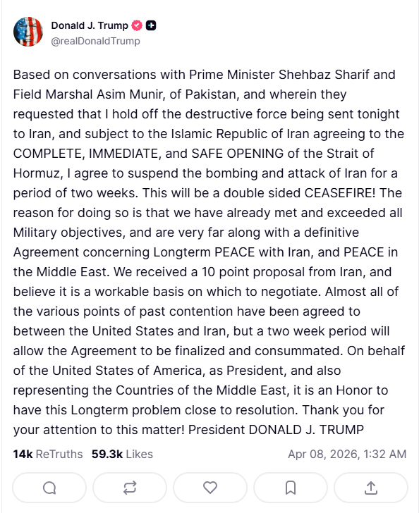 Madaxweynaha mareykanka donald Trump ayaa kudhawaaqay qabad joojin soconeysa laba isbuuc ayadoo la joojinaya weraradiii jogtada aheyd ee kala dhexeyay iran, wuxuuna sheegay inay miska wadahadalka kusolabanayiin labada dal, wuxuu kubahiyay bartiisa social truth