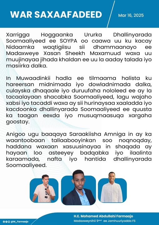 Farmaajo, oo isna war-saxaafadeed gaar ah soo saaray, ayaa sheegay in tallaabadaasi ay muujinayso jiho khaldan oo dalka loo wado, isaga oo carrabka ku adkeeyay in muwaadiniinta aragtidooda dhiibta aan lagu caburin karin cabsi iyo tacaddi.
