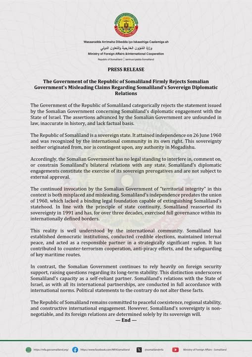 Wararka24: Xukuumadda Somaliland ayaa si adag uga jawaabtay war-saxaafadeed ay soo saartay Dowladda Federaalka Soomaaliya, kaas oo lagu diiday magacaabista safiir ay Israa’iil u dirtay Somaliland.